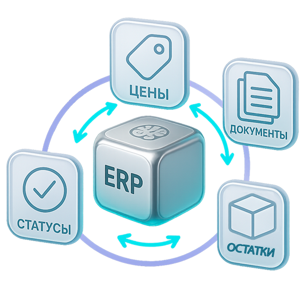 Синхронизация остатков, цен, статусов заказов и документов.